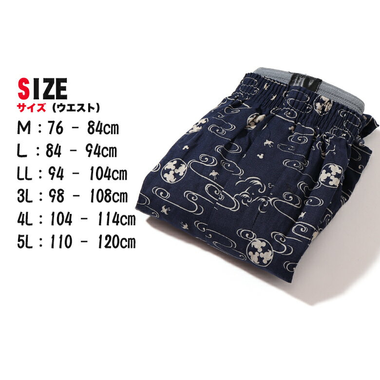 素材 【本体】綿100% 【ウエストゴム】ポリエステル100% サイズ 【表示サイズ】 M:ウエスト76-84cm L:ウエスト84-94cm LL:ウエスト94-104cm 3L:ウエスト98-108cm 4L:ウエスト104-114cm 5L:ウエスト110-120cm 生産国 中国 特徴 前開きボタン留め コメント ミッキー達のイラストが全体に 散りばめられた総柄トランクス。